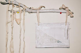 Wire mesh measures approximately 1X1 meters, tied to a tree branch, I used cardboard, zarza laser chipboard die cuts, paper flowers in acrylic, FabScraps paper, frame and bird plaster painted with distress ink from Ranger.